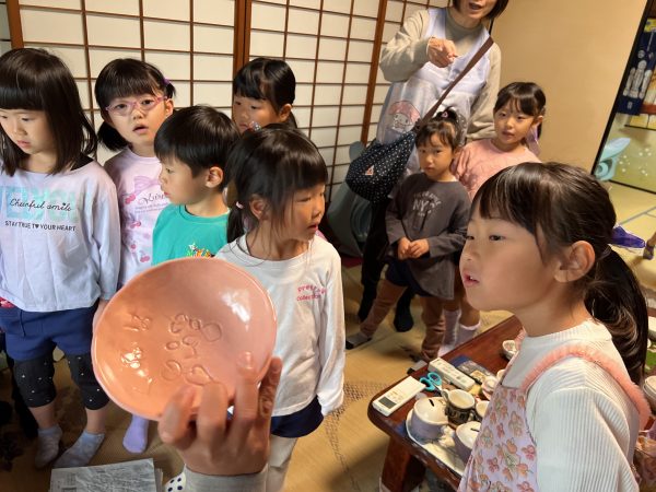 10月22日(水)にきりん組が高浜キッズこども園と合同で、陶芸家の高井晴美先生のご自宅に行き、完成した陶芸の作品を受け取りました。