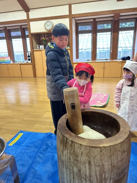 - 最初はもち米をこねて潰しました。少しずつ変化していく様子に、子ども達は驚いていました。
