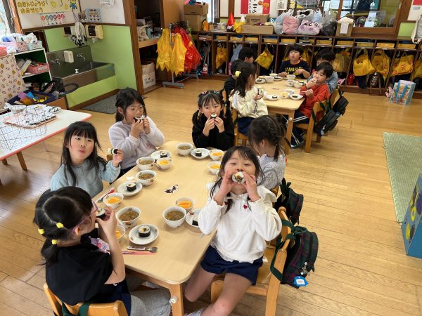 - 鬼を退治してほっとした後は、給食の時間に恵方巻きをたくさん食べました。