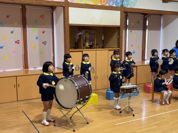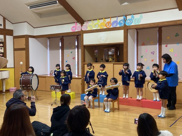 - ぱんだ組の発表です。最初に「おどるポンポコリン」の合奏をしました。